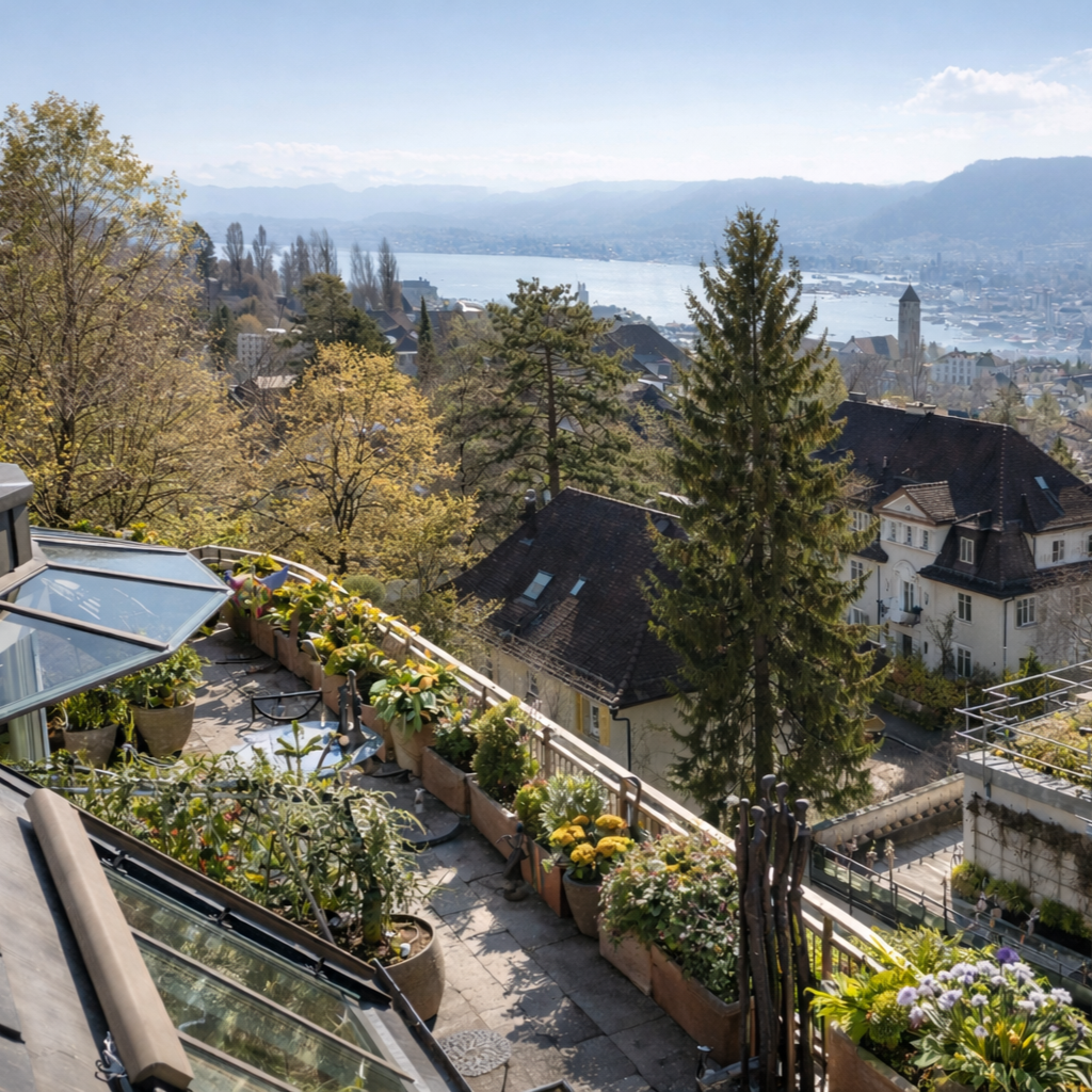 The Zürichberg is one of Zurich's most exclusive residential areas, offering a unique combination of proximity to nature and the advantages of city life. The penthouse apartment is located on a sunny hillside and offers spectacular views over the city, the lake and as far as the Alps.