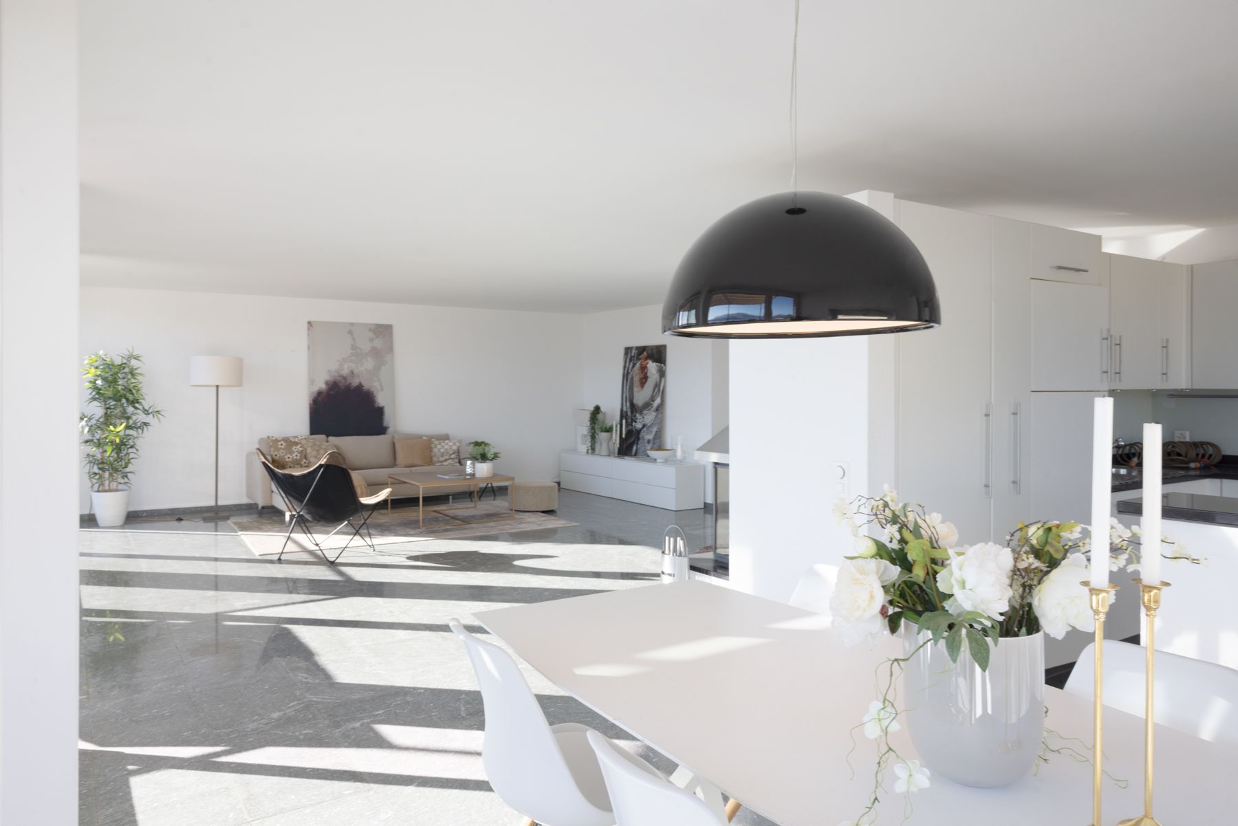 Der lichtdurchflutete Wohn- und Essbereich mit halboffener Küche und Cheminée bildet das Zentrum der Wohnung und gibt direkten Zugang zur ca. 27 m² grossen Terrasse, die einen schönen Blick auf See und Berge bietet. Der private Bereich umfasst ein Master-Bedroom mit En-suite-Bad (Badewanne und Dusche), zwei weitere Schlafzimmer mit Einbauschränken, ein zusätzliches Duschbad sowie ein separates Gäste-WC.