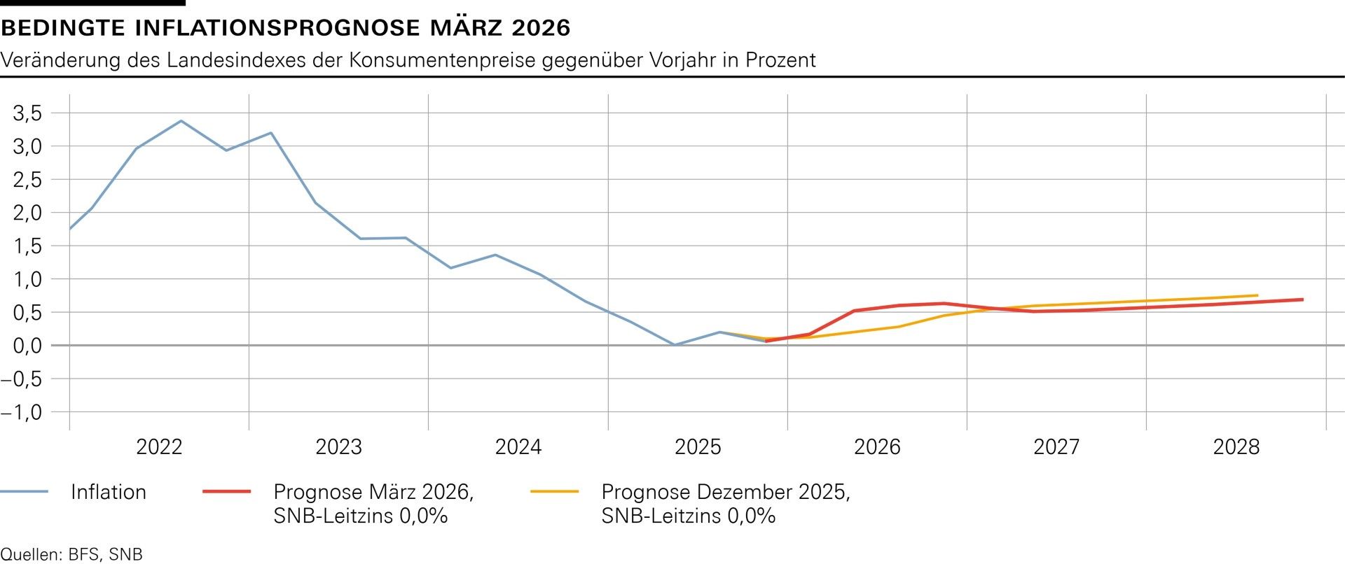Die Prognosen der SNB zeichnen ein Bild von vorsichtiger Zuversicht: Beim Wirtschaftswachstum rechnet die Nationalbank für 2026 mit einem BIP-Wachstum von rund 1%, das sich 2027 auf 1,5% beschleunigen dürfte. Dabei bewegt sich die Teuerung gemäss der Bank weiterhin bis ins Jahr 2028 im Bereich zwischen 0,5% und 0,6%. Die Prognose beruht auf der Annahme, dass der SNB-Leitzins über den gesamten Prognosezeitraum 0% beträgt.