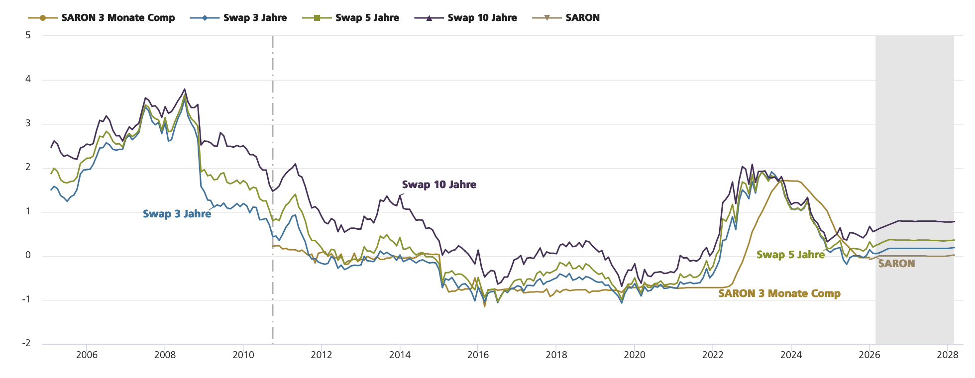 Auch die UBS rechnet in ihrer jüngsten Zinsprognose mit weiterhin tiefen Zinsen. Aber der Irankonflikt überschatte die Lagebeurteilung der SNB, schreibt die Bank. Dennoch teile sie die Einschätzung der SNB und rechne in den kommenden zwölf Monaten nicht mit einer Änderung der Geldpolitik. «Solange die SNB an ihrer Nullzinspolitik festhält, dürfte das Zinsniveau im historischen Vergleich sehr tief bleiben. SARON-basierte Hypothekarzinsen dürften sich seitwärts entwickeln.» (Zitat UBS)